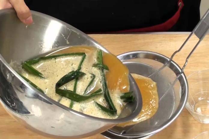 ១.យកចានធំល្មមគោះពងមាន់ដាក់ចូល ដាក់ស្ករត្នោត ខ្ទិះដូង និងស្លឹកតើយ លាយច្របល់ចូលគ្នាឲ្យសព្វល្អ