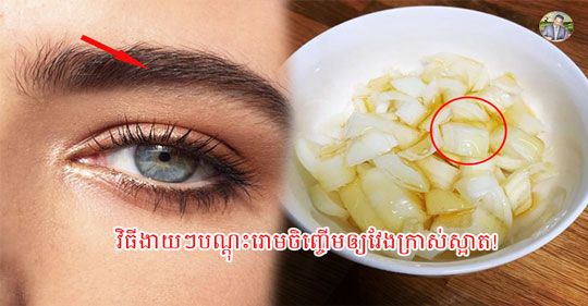+វិធីធ្វើ៖ ពុះខ្ទឹមបារាំងជា៣ លាងទឹកឲ្យស្អាត យកតែមួយចម្រៀកបានហើយ រួចកិនឲ្យម៉ដ្ឋដោយម៉ាស៊ីនកិន។ បន្ទាប់មកយកកាកចេញ ត្រងយកតែទឹកប៉ុណ្ណោះ។ យកទឹកខ្ទឹមបារាំងដាក់ចូលចាន លាយទឹកឃ្មុំចូលកន្លះស្លាបព្រាបាយ កូរឲ្យសព្វសាច់ល្អ។ មុនយកទៅលាប ត្រូវលាងសម្អាតត្រង់បរិវេណរោមចិញ្ចើមជាមួយទឹកទឹកក្ដៅឧណ្ហ៍ៗសិន ដើម្បីឲ្យរន្ធញើសបើកធំជាងមុន។ យកកន្សែងស្អាតជូតទឹកឲ្យស្ងួត ហើយប្រើសំឡីជ្រលក់ទឹកខ្ទឹមបារាំងដែលលាយហើយ យកទៅលាបលើរោមចិញ្ចើមអូសពីលើក្រោមឡើងលើ ទុកចោលមួយយប់ សឹមលាងចេញជាមួយទឹកត្រជាក់នៅពេលព្រឹក។ គួរអនុវត្តឲ្យបាន៣ដងក្នុងមួយសប្តាហ៍។ ត្រឹមរយៈពេលពីរសប្តាហ៍ប៉ុណ្ណោះ អ្នកនឹងឃើញថា រោមចិញ្ចើមពិតជាដុះវែងក្រាស់ដូចប្រាថ្នា។