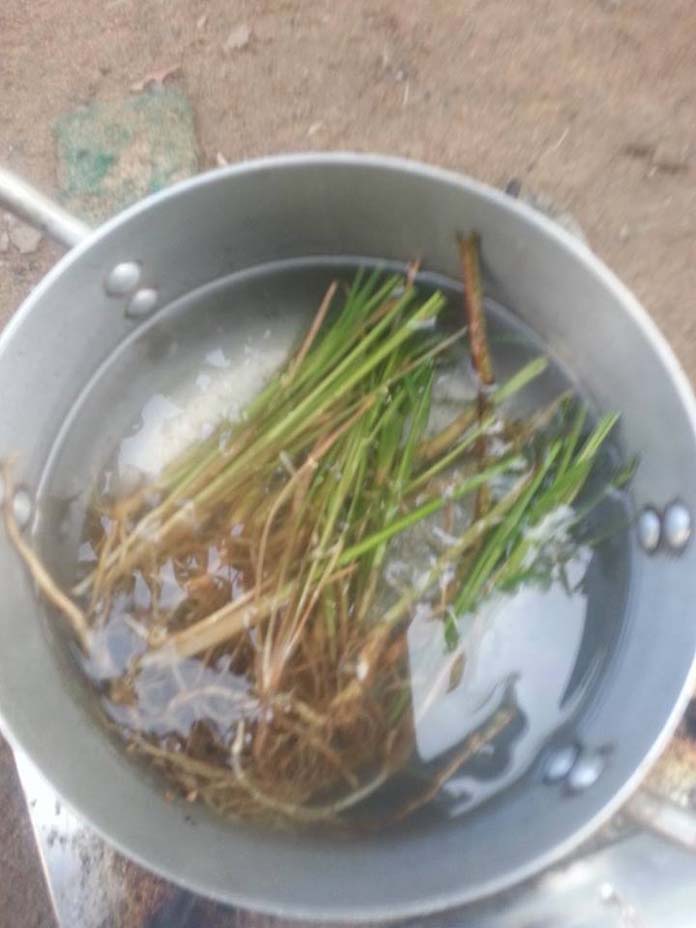 -យកឫសកន្ទ្រាំងបាយស ចំនួន៧ដើម ឫសស្បូវប្រក់ដំបូល៧ដើមលាងទឹកឲ្យស្អាត