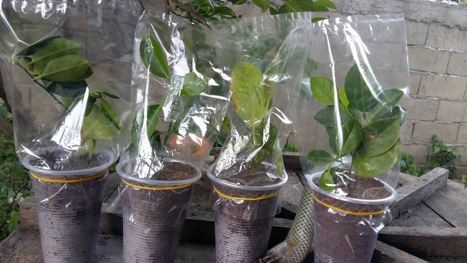 – ដោតមែកក្រូចឆ្មារចូល រួចសង្កត់ជុំវិញឱ្យណែន ហើយយកថង់ច្រកមកស្រោបពីលើ រួចយកកៅស៊ូចងផ្អោបមាត់ថង់ជាមួយកែវជ័រឱ្យជិត តែកុំរិតខ្លាំងពេកការពារកុំឱ្យបែកដី