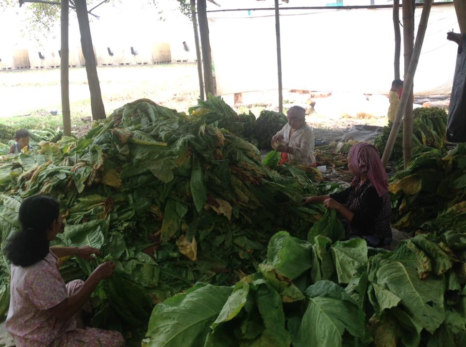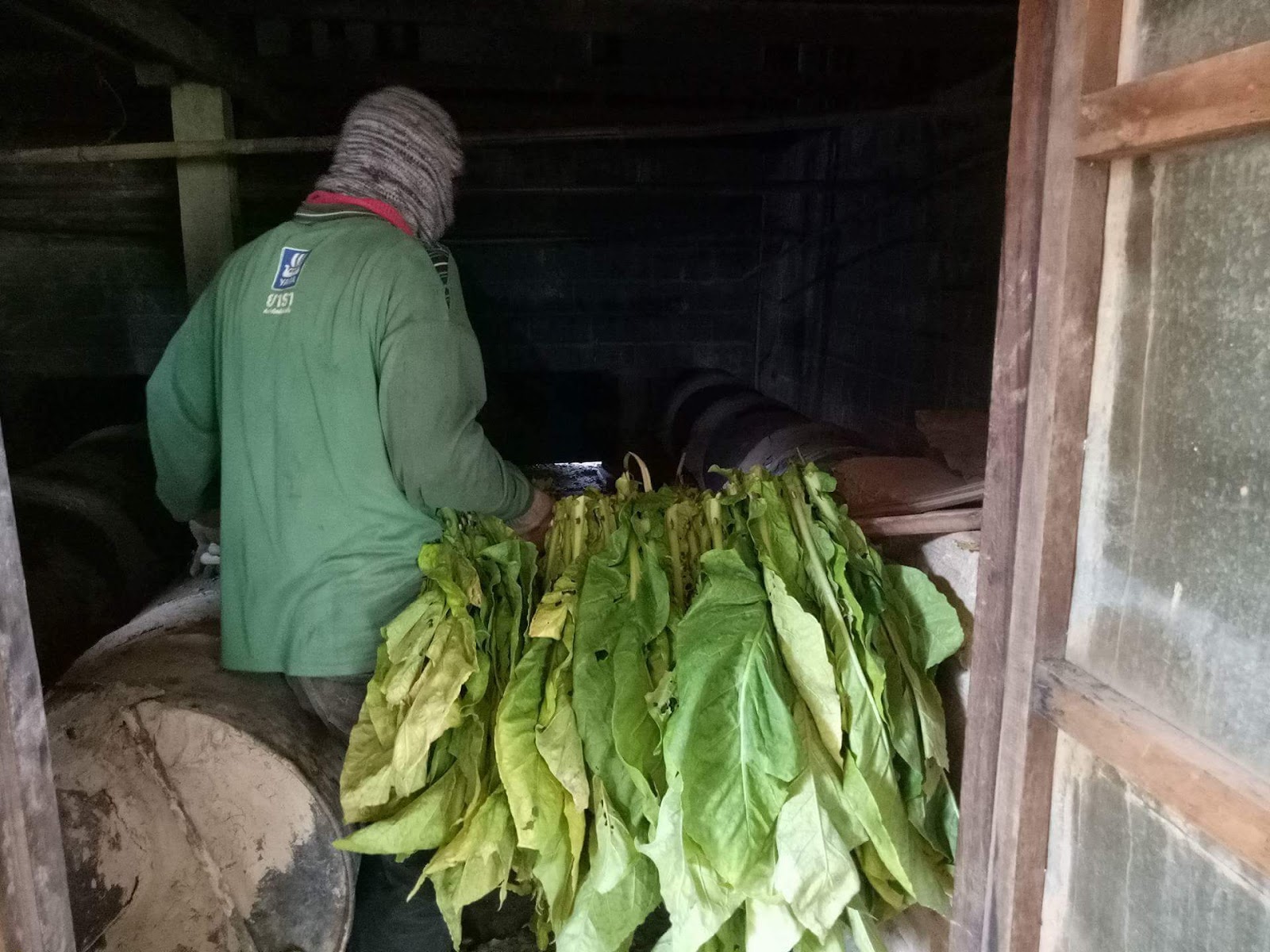 – បន្ទំរយៈពេលប្រហែលពី បីថ្ងៃ សង្កេតមើលនៅពេលស្លឹថ្នាំប្រែពណ៌ជាលឿង ទើបគេយកវា ម្តងម្តុំៗ មកសកយកទ្រនុងចេញ ទុកតែស្លឹក