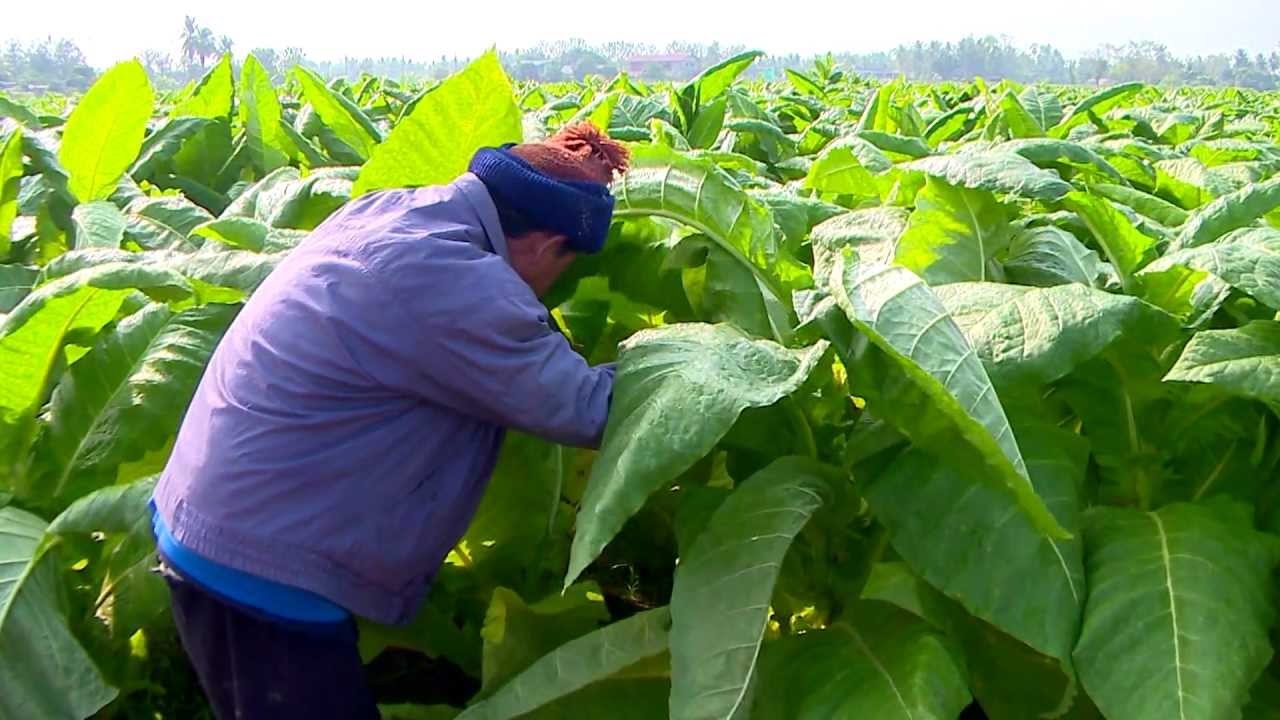 -បន្ទាប់ពីកាច់ស្លឹករះជើងរយៈពេលបួនប្រាំថ្ងៃ សន្លឹកថ្នាំក្រោម និងចាស់ជាបន្តបន្ទាប់ (ស្លឹកថ្នាំគេកាច់ពិក្រោមឡើងទៅលើ)។ គេកាច់ជាបន្តបន្ទាប់រហូតដល់សន្លឹកចុង។ សន្លឹកថ្នាំខាងចុងជាសន្លឹកថ្នាំល្អជាងគេបំផុត វាខ្លាំងជាងសន្លឹកក្រោម។ កាលណាកាច់អស់នៅសល់ត្រចៀកថ្នាំដែលជាជាប់នឹងដើម ក៏គេប្រមូលផលមួយចំណែក