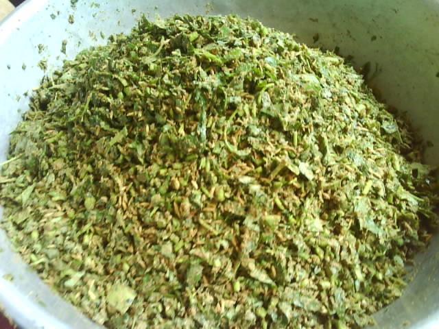 លើកចេញទុកឲ្យត្រជាក់ (នៅក្តៅអ៊ុនៗ) លាយគ្រឿងផ្សំផ្សេងៗទៀតចូលសម្រាប់ធ្វើជាចំណីជ្រូក។ សម្រាប់មាន់ទាវិញ ចាំបាច់ត្រូវលាងស្លឹក និងឫស ឬដៃទាំងនោះឲ្យស្អាត ទើបយកមកកិន ឬចិញ្ច្រាំឲ្យខ្ទេចមុនដាក់លាយជាមួយវត្ថុធាតុដើមផ្សេងទៀត។ មុនយកមកលាយចាំបាច់ត្រូវហាលឲ្យស្ងួត ទើបកិនឲ្យខ្ទេច។