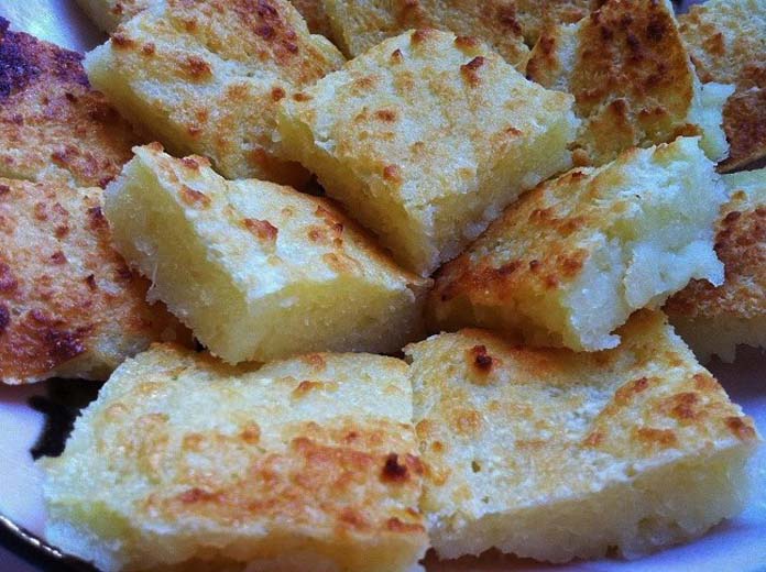 គ្រឿងផ្សំ: ម្សៅដំណើប ៨០ក្រាម, ម្សៅមី ៤០ក្រាម, សាច់ដូងកោស ១៥០ក្រាម, ស្ករស ១០០ក្រាម, ស៊ុត ២គ្រាប់, ខ្ទិះដូង ១២០ក្រាម, ប្រេងឆា បន្តិច។