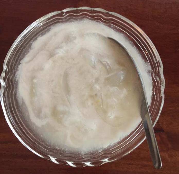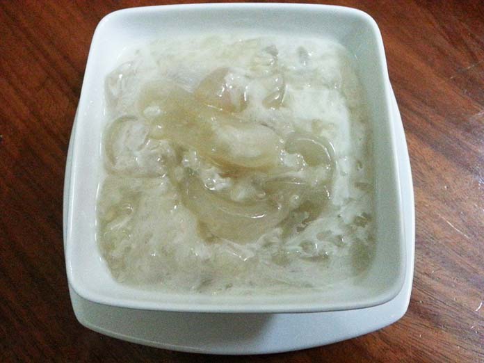 ៣.បន្ទាប់មកដាក់ស្ករស អំបិល ខ្ទិះដូង គ្រាប់ត្នោតចូល ច្របល់ចូលគ្នាឲ្យសព្វ គ្របទុកឲ្យឆ្អិន ហើយដួសដាក់ចាន ជាការស្រេច។