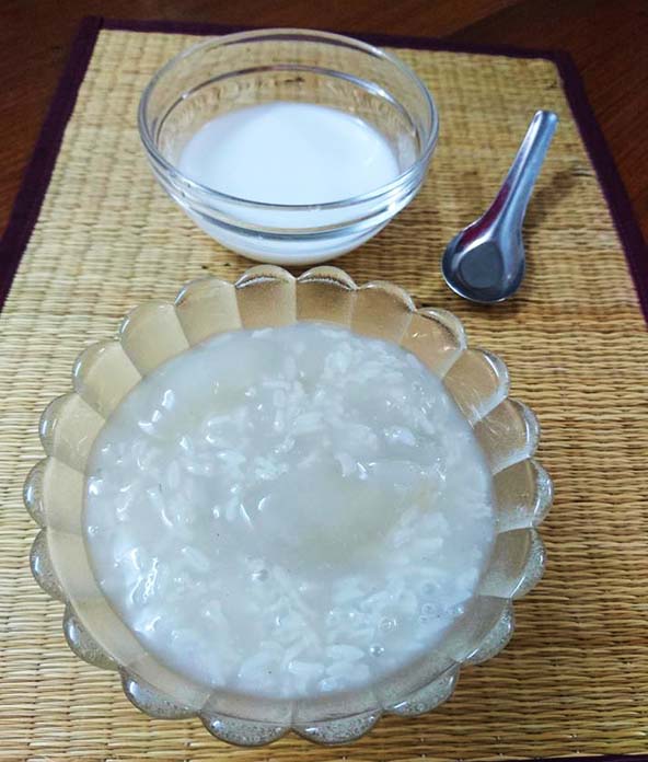 ២.ដាក់ទឹកចូលឆ្នាំង ទុកមួយរំពុះ រួចដាក់អង្ករដំណើបចូល កូរឲ្យសព្វ ទុករហូតគ្រាប់អង្កររីកហើយទន់