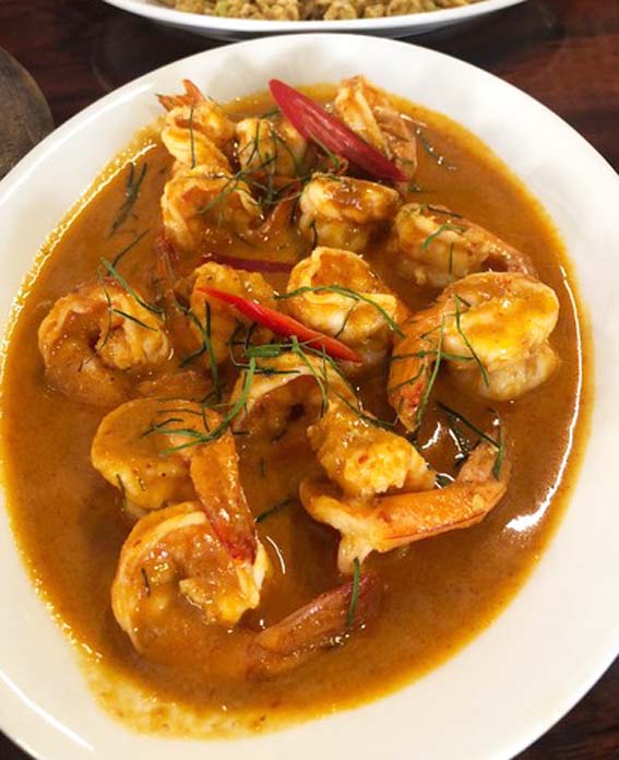 គ្រឿងផ្សំ៖ បង្គា ៨-១០ (បកសំបកក៏បាន មិនបកក៏បាន), ខ្ទិះដូង ១០០ក្រាម, គ្រឿងការីបុក ២ស្លាបព្រាបាយ, ទឹកត្រី ១ស្លាបព្រាបាយកន្លះ, ស្ករ ១ស្លាបព្រាបាយ, ម្ទេសដៃនាង និងស្លឹកក្រូចសើច ហាន់។