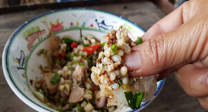 +របៀបធ្វើ៖-បុកម្ទេស និងខ្ទឹមសអោយម៉ត់ រួចដួសដាក់ក្នុងចានមួយ សឹមដាក់ស្ករ ទឹកត្រី ម្ទេសជ្រក់ និងទឹកក្រូចឆ្មារចូលកូអោយសព្វទុកមួយអន្លើ។យកពងអង្រ្កដាក់ក្នុងចានមួយ រួចដាក់ខ្ទឹមក្រហម ស្លឹកជី និងស្លឹកខ្ទឹមច្របល់អោយសព្វ ជាការស្រេច៕