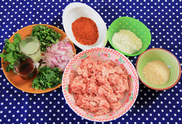 +គ្រឿងផ្សំ៖-សាច់គោ ហាន់ជាបន្ទះ ( យកសាច់ផុយ )-អង្ករលីង ( បុកអោយម៉ត់ )-ខ្ទឹមស ខ្ទឹមក្រហម ( ហាន់ជាបន្ទះស្ដើងៗ )-ទឹកត្រី ស្ករស ម្សៅស៊ុប ម្ទេសម៉ត់ និង ក្រូចឆ្មា-បន្លែរួមមាន ត្រសក់ សណ្ដែកគួរ ស្ពៃក្ដោប ជីបន្លា ជីអង្គាម