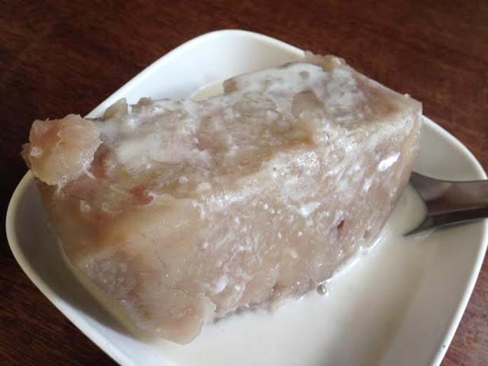 គ្រឿងផ្សំ៖ ត្រាវ ៦៥០ក្រាម កាត់ជាដុំធំៗល្មម, ទឹកស្អាត ១ចាន, ស្ករស ៣០០ក្រាម, ខ្ទិះដូង កន្លះកូនចាន, ម្សៅអង្ករ ១ស្លាបព្រាកាហ្វេ, អំបិល ១ស្លាបព្រាបកាហ្វេ។