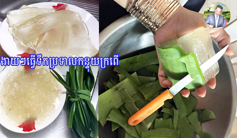 +គ្រឿងផ្សំដែលត្រូវមាន -ប្រទាលកន្ទុយក្រពើ(២-៣ធាង)-ស្លឹកតើយ(១០ស្លឹក) -ស្ករស(៣០០ក្រាម) -ទឹកស្អាត(៥០០មីលីត្រ)+វិធីធ្វើ -ដំបូងយើងយកប្រទាលទៅលាងទឹកឲ្យស្អា...
