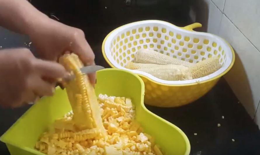 ៤. ស្រង់ស្នូលពោត និងស្លឹកតយចេញ យកទឹកដែលដាំពុះនោះមកកិនជាមួយសាច់ពោតដែលឈូសរួចបញ្ចូលគ្នា